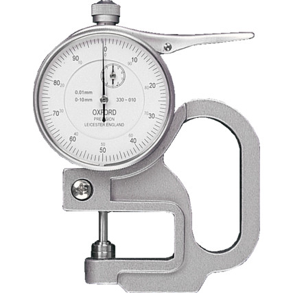 Na rýchle meranie hrúbky papiera, filmu, kože, gumy atď. Vreteno sa pohybuje pomocou páky. S nastaviteľným rámom. Meracie plochy sú vyrobené z vysoko kvalitnej nástrojovej ocele, kalené, brúsené a precízne lapované. Páka zdvíha vreteno, aby bolo možné vkladať obrobky.